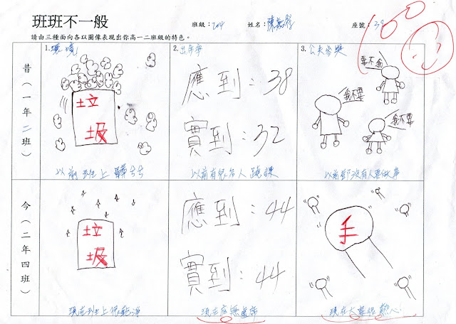 這裡非常清楚地看到學生能夠透過班級整潔、導師講話風格、上課氛圍、人際互動等來比較其中的變化。有趣的是學生們是否參考過彼此的作品,再獨特的作品都禁不起抄襲,即使圖像改過,很快抓包。創意就是跟別人不一樣,看人所不能看,將細微處放大成為自己的天空,創造出自己的世界。既然鼓勵學生做個不一樣的人,老師就得學習正面地看待學生的作品,無須認為學生批評自己而產生不必要的誤解,扼煞了學生的巧思。